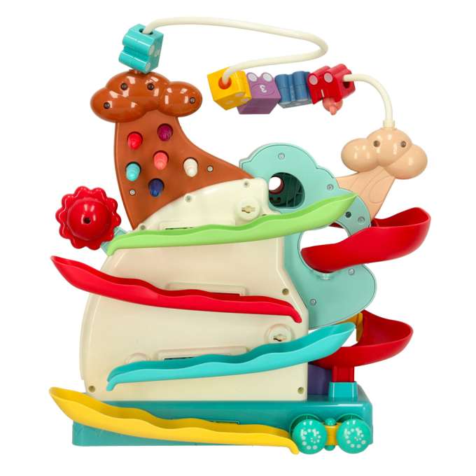 Pramogų įvairovė - du rutuliniai takai, vagonai su numeriais ir žaidimas „Meded the Bird“ užtikrina įvairias linksmybes, kad žaislas greitai nebūtų nuobodus
