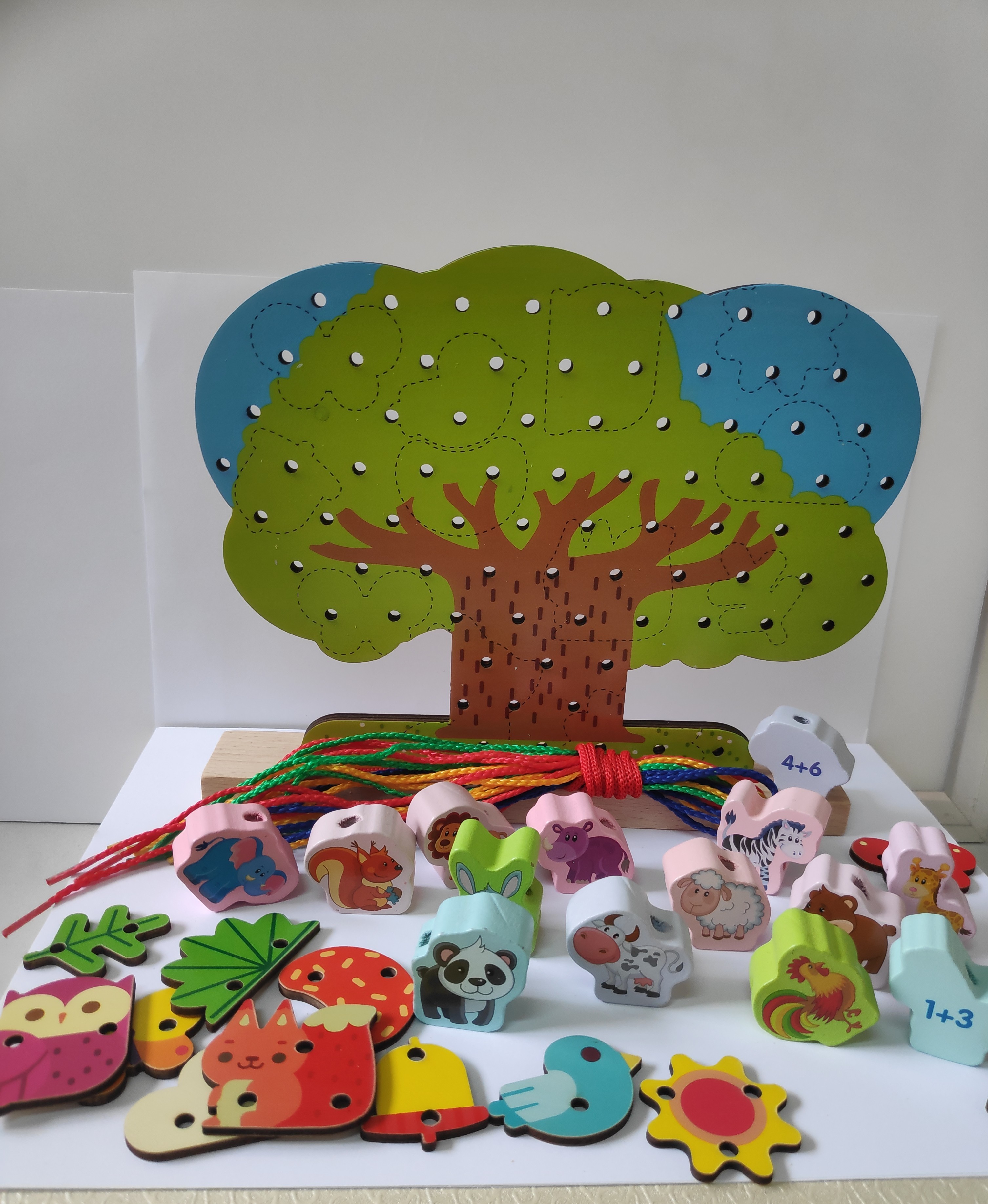 Puiki lavinamoji priemonė,kurią sudaro geros kokybės medinės gyvūnų figūros su skylutėmis.Vienoke puseje pavaizduotas gyvūnas ,o kitoje matematinė sudeties ar atėmimo užduotis..