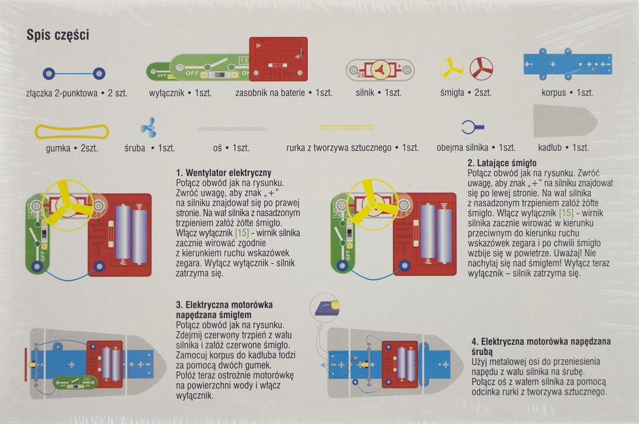 Rinkinyje yra: 2 taškų jungtis - 2 vnt jungiklis - 1 vnt baterijų dėklas - 1 vnt variklis - 1 vnt propeleriai - 2 vnt korpusas - 1 vnt trintukas - 2 vnt varžtas - 1 vnt ašis - 1 vnt plastikinis vamzdis - 1 vnt variklio spaustukas - 1 vnt korpusas - 1 vnt