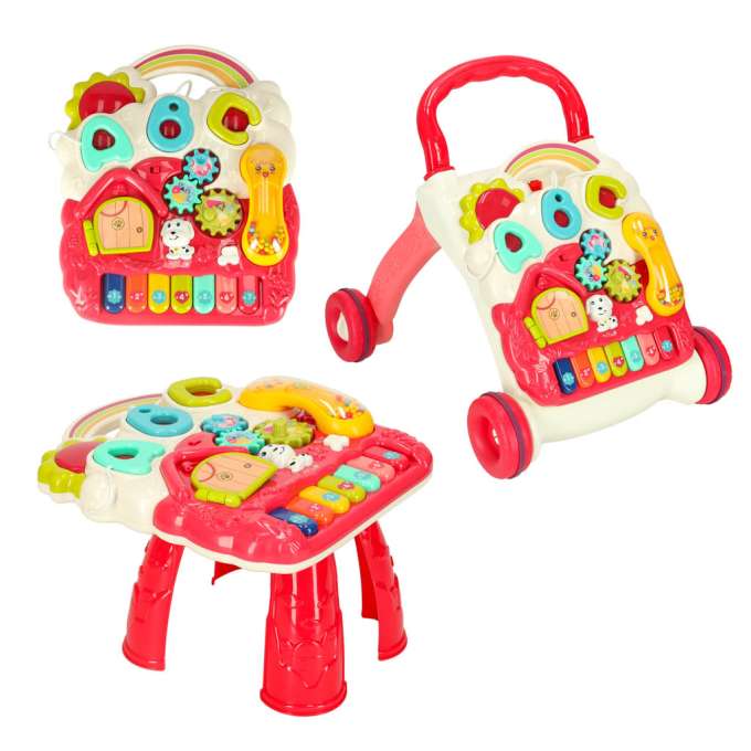 Keturi gaminiai viename - komplekto elementai gali būti keičiami, gaminį paverčiant interaktyvia lenta, mokomuoju stalu ar praktiška vaikštyne palaiko vaiko vystymąsi – rinkinys tobulina tokius įgūdžius kaip: judesių-akių koordinacija, rankiniai įgūdžiai, padeda žengti pirmuosius žingsnius mokymąsi derina su žaidimu – daugybė interaktyvių elementų suteikia teigiamų emocijų. Žaidimo metu mažylis išmoks pagrindinių skaičių, raidžių ir spalvų pavadinimų.Interaktyvioje lentoje yra daug elementų , kurie stimuliuoja vaiko pojūčius ir padeda lavinti rankinius įgūdžius .Stalas, tiek vaikštynė puikiai priderinami prie mažylio ūgio , todėl kiekvienas žaidimas prie stalo ir mokymasis vaikščioti yra patogus ir saugus!