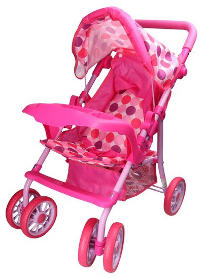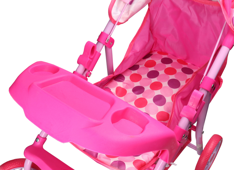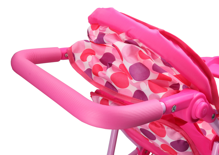 Vežimėlis turi patogią, reguliuojamą rankeną su putplasčio užvalkalu, krepšelį pirkiniams ar lėlės aksesuarams, užsegimą kūdikiui.