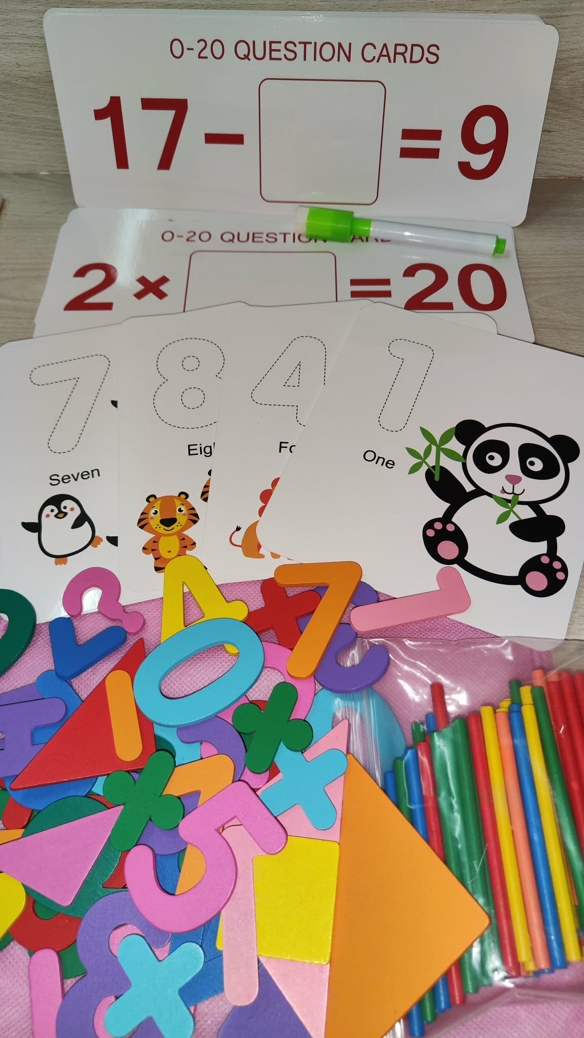 Rinkinyje rasite korteles su gyvūnais, užduočių nutrinamas korteles su rašikliu .mediniai skaičiai ,pagaliukai ir geometrines figuros..viskas yra labai geros kokybės. Komplekte rasite medžiaginį maišelį kuriame galėsite saugoti raides ir t.t