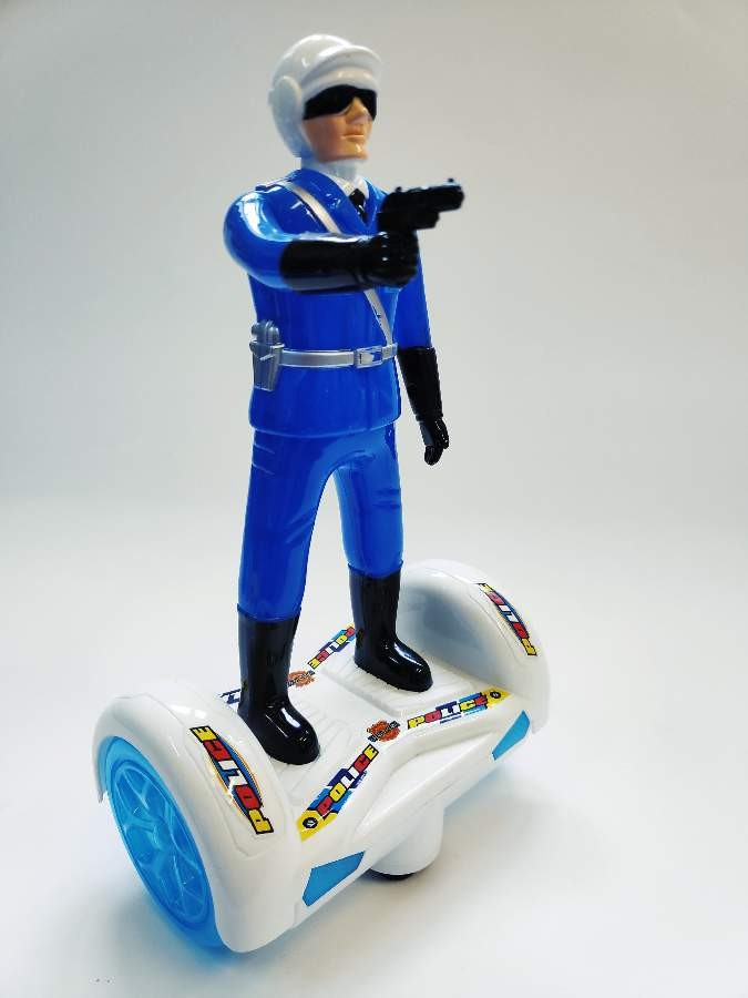 Policininkas su riedžiu turi įvairius garsinius signalus,mirksinčias šviesas,funkciją ,frazės iš policininko kasdienybės:šausiu.stop...