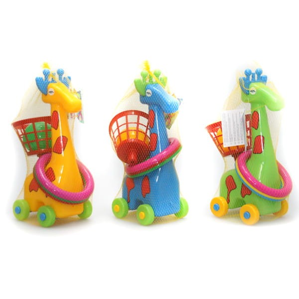 Ant žirafos kaklo reikia užmauti skirtingų spalvų žiedus arba i krepšelį įdėti kamuoliuką